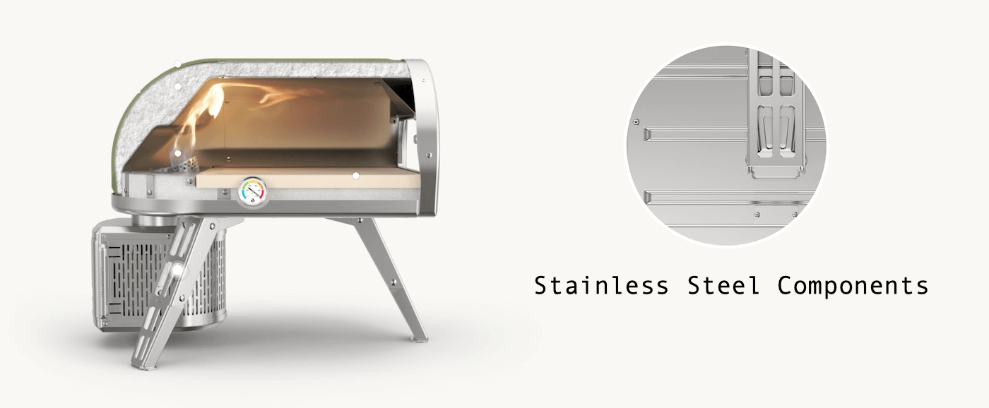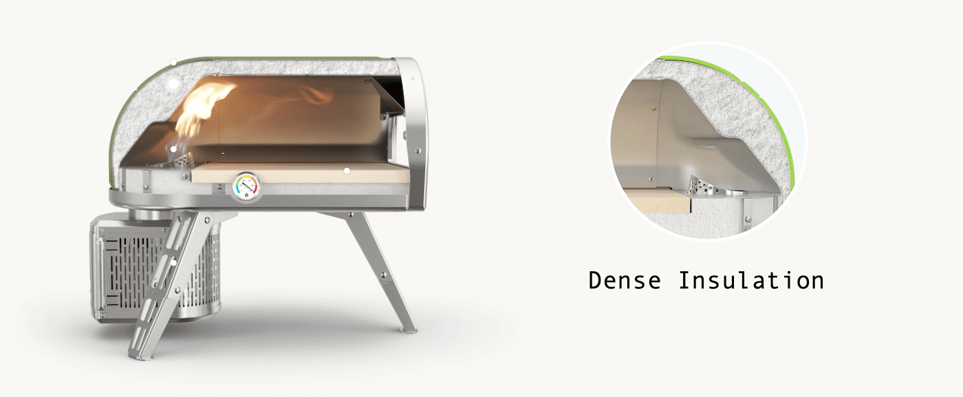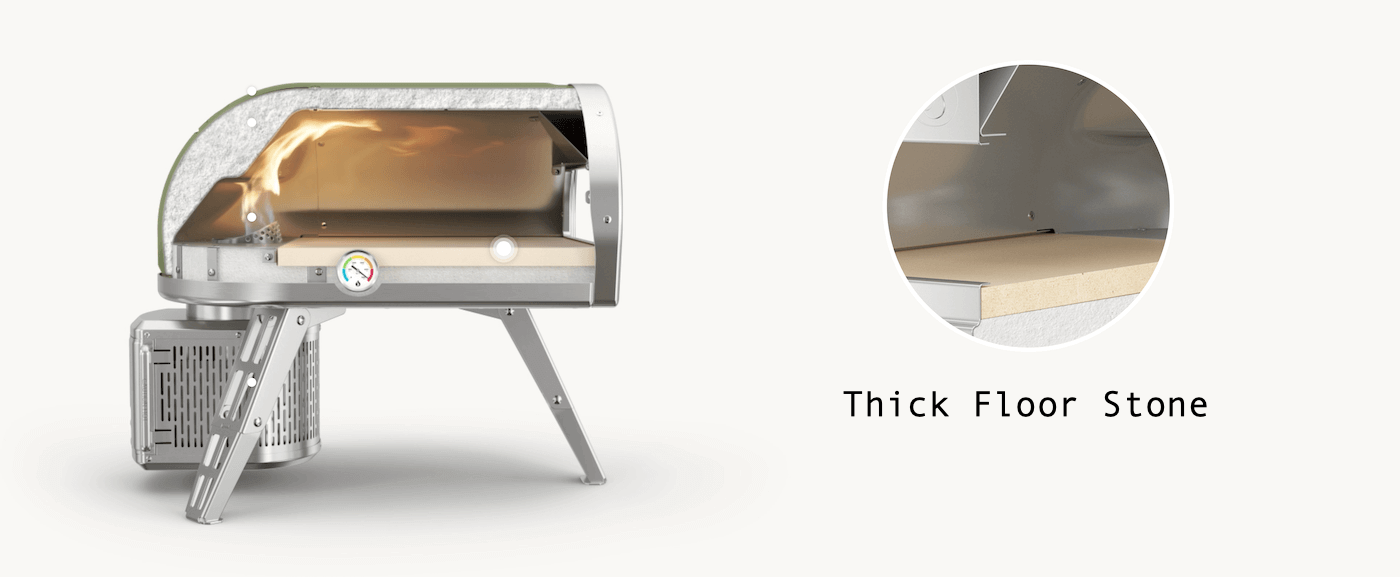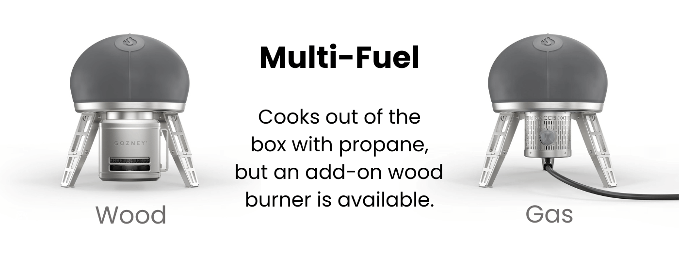 Capable of reaching 950°F, its thick stone floor, dense insulation, and unique rolling flame ensure unparalleled cooking results — nailing Neapolitan pizza in as little as 60 seconds. Choose between a propane gas burner or a detachable wood burner as an add-on.